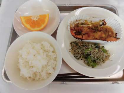 【献立】ごはん・鮭のチャンチャン焼き・青菜の乾物あえ・いよかん・牛乳