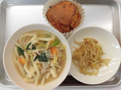 【献立】みそ煮込みうどん・もやしのカレー醤油かけ・キャロットケーキ・牛乳