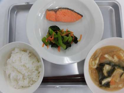 【献立】ごはん・鮭の塩焼き・こまつなのひたし・みそ汁・牛乳