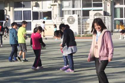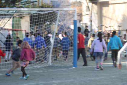 みんなパズルのピースを集めるために、校庭を見まわしています。