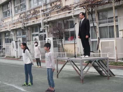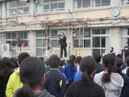 校庭に集まった子どもたちは校長先生と挨拶をします。