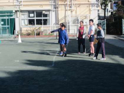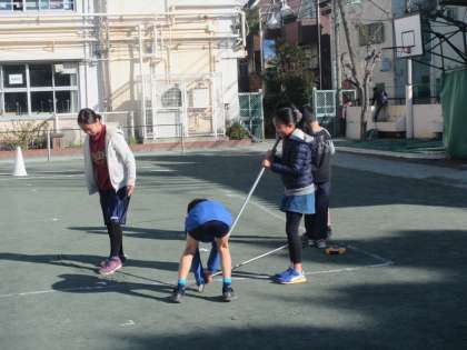 メジャーと鉄の棒を使って大きなコンパスにします。