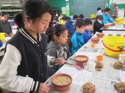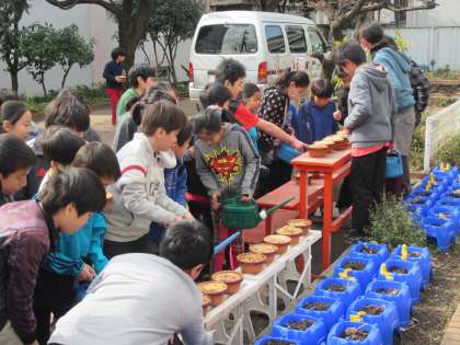 サギソウの球根を慈しむように植える5年生。