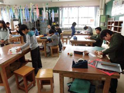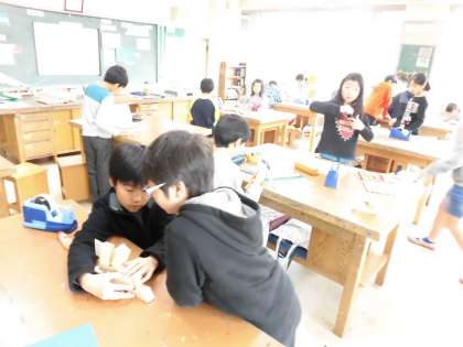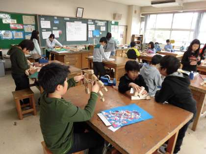 図工の時間に4年生は木と木を組み合わせた工作をしています。