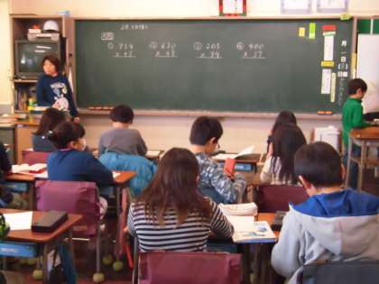 3年生が算数の時間にかけ算の筆算を学習しています。