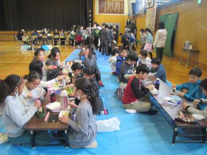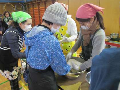 熱いおもちを一つひとつちぎってくださるPTAの皆様。