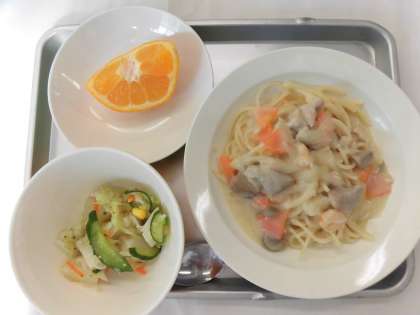 【献立】スパゲティークリームソース・ポテト入りフレンチサラダ・いよかん・牛乳