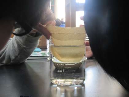 コーヒーフィルターを通して溶ける塩の周りの水は、もやもやとしています。