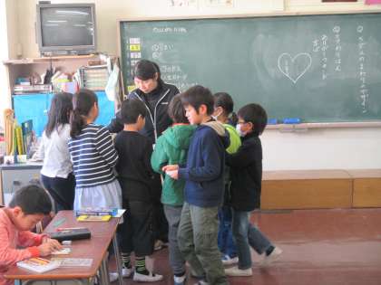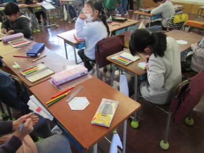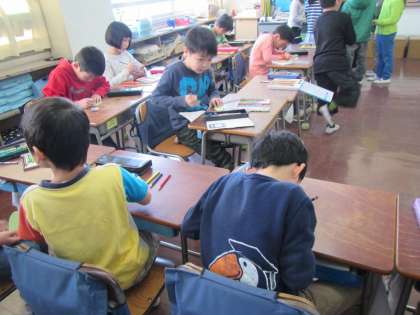 出来上がった作品を先生にチェックしてもらい、にっこりの2年生です。