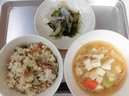 【献立】豚肉とごぼうのごはん・じゃこサラダ・みそ汁・牛乳