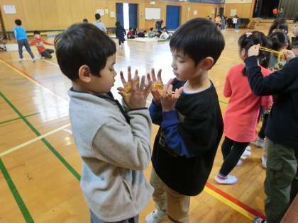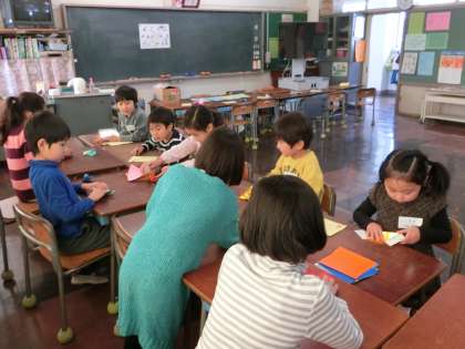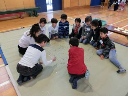 すっかり頼もしくなった2年生が、こちらもしっかりとした1年生に昔遊びを教えます。