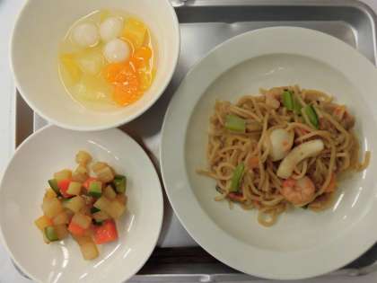 【献立】五目焼きそば・コロコロ野菜・フルーツパンチ・牛乳
