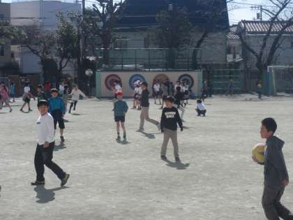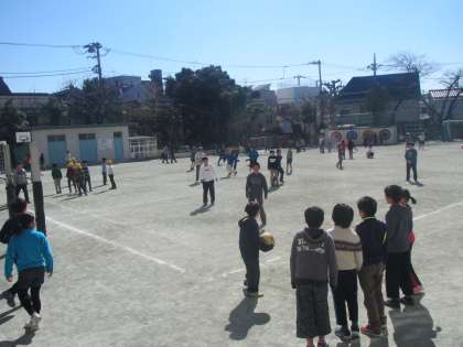 校庭で子どもたちが気持ちよさそうに遊んでいます。