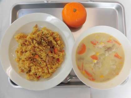 【献立】カレーピラフ・クリームスープ・みかん・牛乳