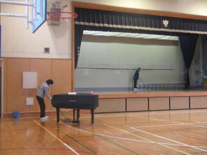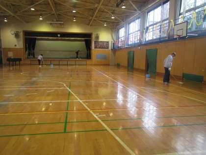 卒業式に向けて、主事さんたちが体育館にワックスがけをしています。