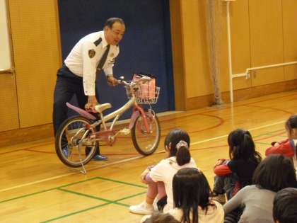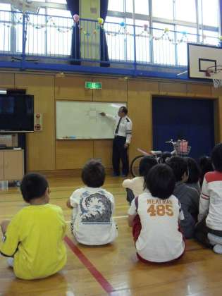 3年生は、おまわりさんに自転車の乗り方を習うのを楽しみにしていました。当日は、朝からの雨が降っててしまたので、体育館で行いました。実際に、自転車に乗ることはできませんでしたが、交差点での待ち方や、自転車の乗り方など、大切なことを教えていただきました。最後にかわいいキャラクターのピーポくんが登場するビデオを見ました。