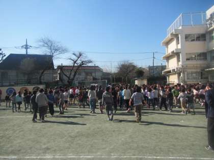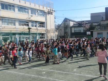 みんな音楽を聴き、質問を聞いて○、×に移動します。