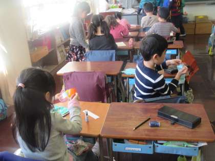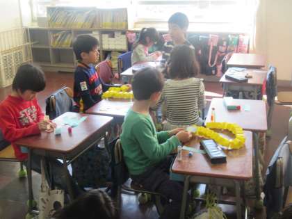 1年生は、4月に入学してくる1年生のために、輪飾りをつくっています。