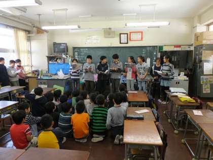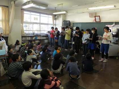 発表後、2年生のそれぞれのクラスから、「きつねのおきゃくさま」を読んでもらったり、歌を披露してもらったりと、サプライズまでしてもらいました。これには6年生も大喜び。