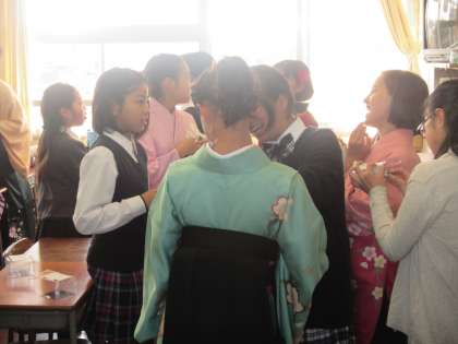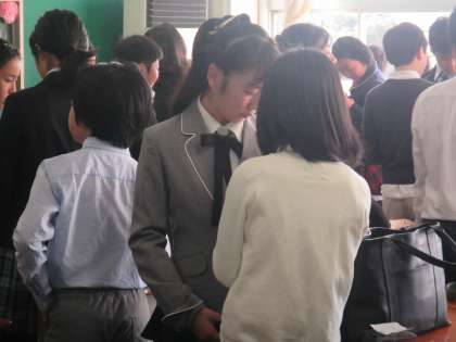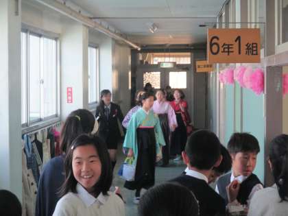 在校生を代表して5年生が6年生の胸にコサージュをつけます。