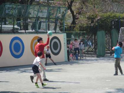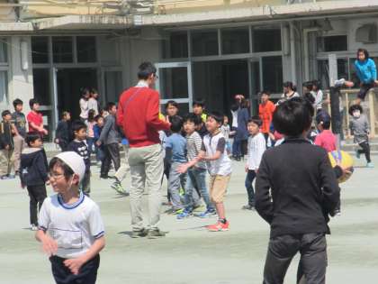 中休みの校庭では子どもたちが元気いっぱいに遊んでいます。