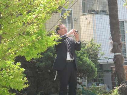 休み時間には看護当番の先生が校庭の見守りをしています。