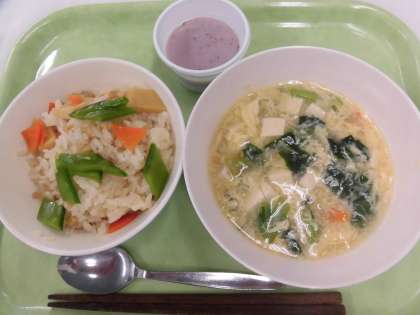 【献立】たけのこごはん・かきたま汁・いちごゼリー・牛乳