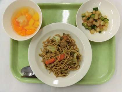 【献立】ソース焼きそば・きゅうりと大根の中華風・フルーツポンチ・牛乳