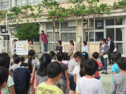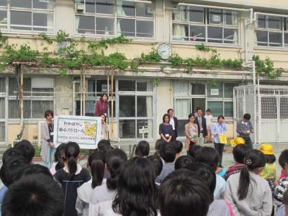 朝会にPTA役員さんがやってきてくれました。