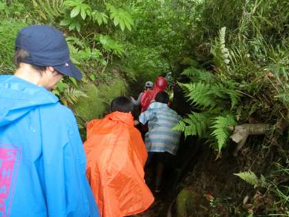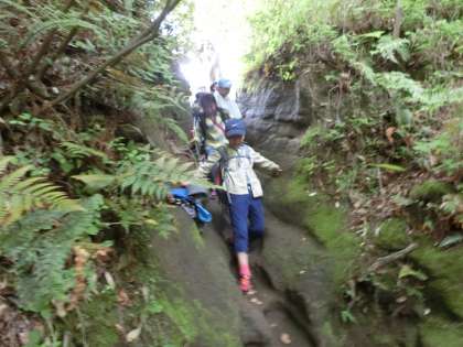 険しい山道をゆく高学年たち。