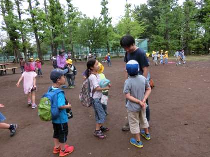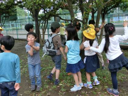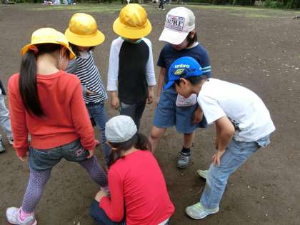 2年生が1年生をリードしてあげながら、元気いっぱいに遊んでいます。