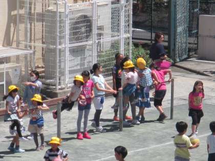 今日は夏のような陽気になりましたが、1年生と6年生が仲良く遊んでいます。