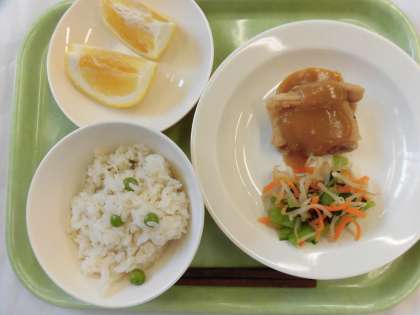 【献立】グリンピースごはん・とり肉の梅みそかけ・おひたし