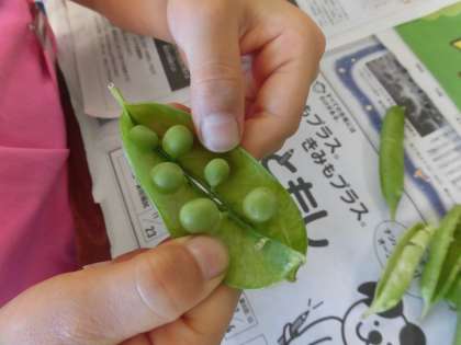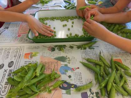 1年生が今日の給食に使われたグリンピースむきをしました。