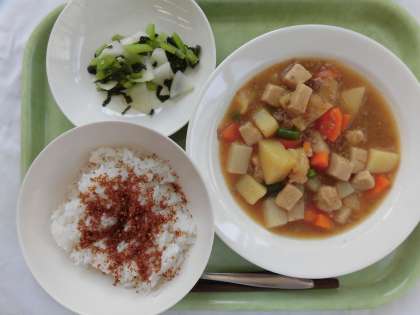 【献立】ごはん・かつおふりかけ・新じゃが芋のそぼろ煮