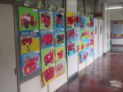消防車の特徴をよくとらえた描写で、今にも走り出しそうな作品がいっぱい!