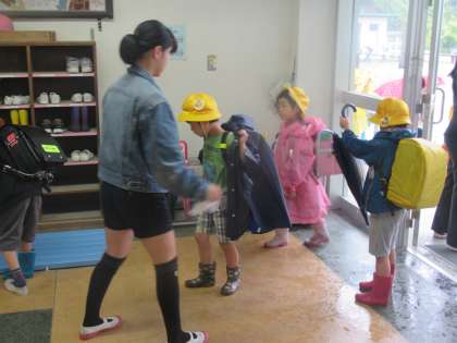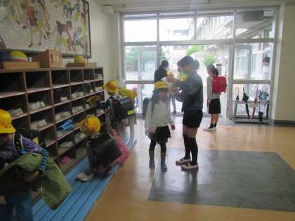 6年生は雨に濡れた1年生の帽子を拭いてあげたり、傘をたたむのを手伝ったりと大活躍です。