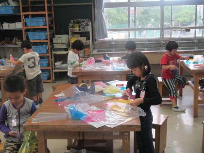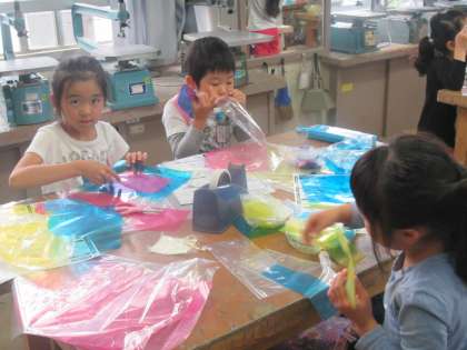 セロファンを切り取ってビニール袋につめ、造形をします。