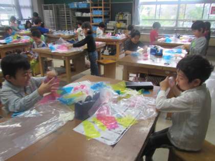 1年生は図工の時間に立体作品「ひかりのくにのなかまたち」を制作中です。