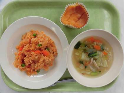 【献立】チキンライス・キャベツスープ・チーズケーキ・牛乳