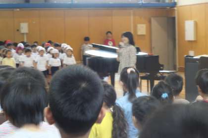 若小名物の一つ、音楽朝会で、全校合唱「緑のラララ」を熱唱しました。