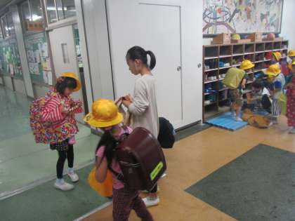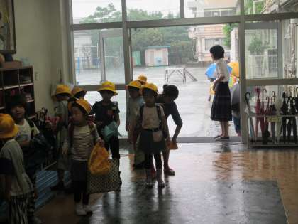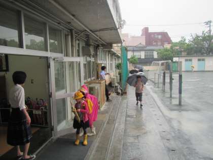 1年生たちが濡れて登校するのを予期して、6年生のお姉さんたちが出迎えていました。