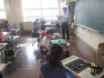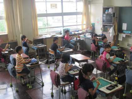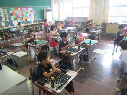 真新しい筆をしっかりともち、意欲満々の3年生たち。