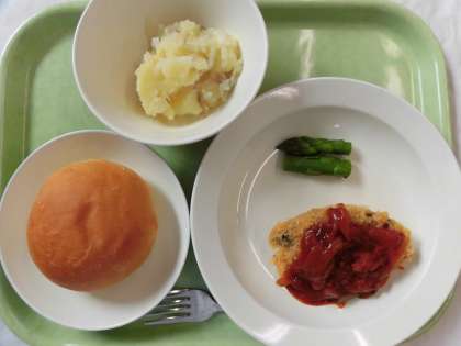 【献立】丸パン・魚のフライ(マッシュルームソース)・ゆでアスパラ