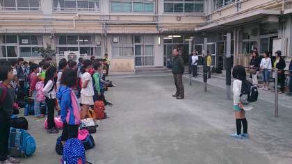 天気は曇り。出発式では司会や代表で挨拶をする児童ががんばりました。