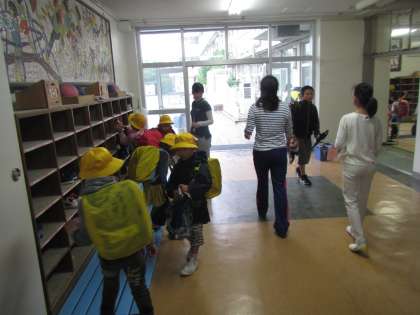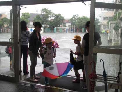 雨の中登校してきた1年生を迎えるべく、タオルをもった6年生が待ち受けています。