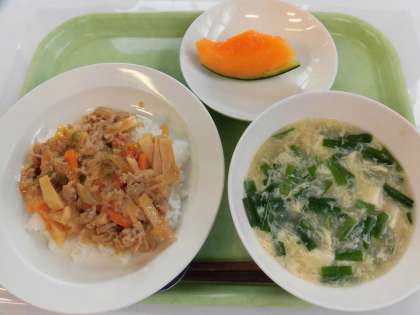 【献立】スタミナ丼・にらたまスープ・メロン・牛乳