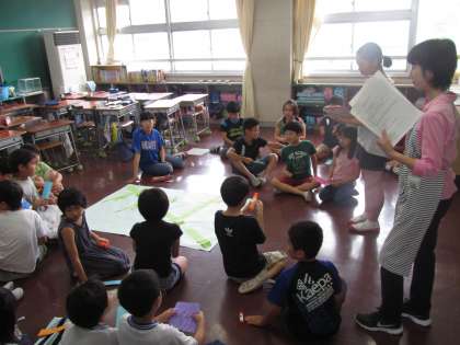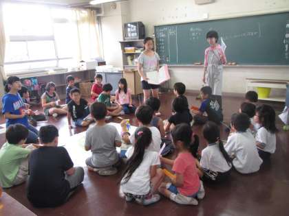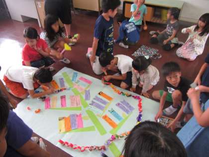 みんなで持ち寄った短冊を模造紙にはり、1年生が作ってくれた七夕飾りでデコレーションをします。