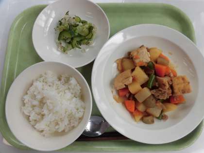 【献立】ごはん・五目うま煮・野菜のゆかりかけ・牛乳