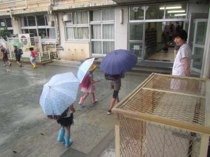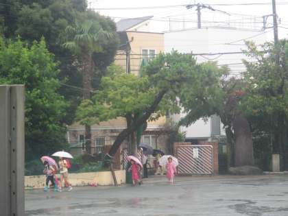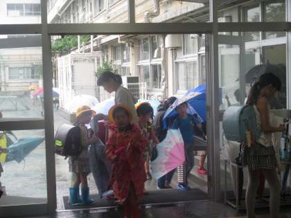 雨の中元気に登校してくる子どもたちを先生も迎えています。